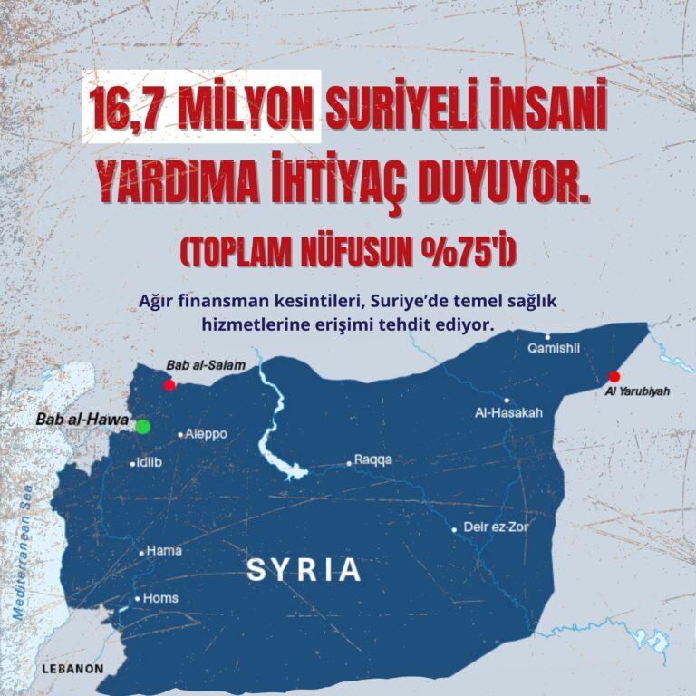 Suriye’de bu yıl, nüfusun %75’inden fazlasını temsil eden 16,7 milyon kişi yardıma ihtiyaç duymaktadır. İnsani yardım aktörleri genellikle bölgedeki tek sağlık hizmeti sağlayıcısı olduğundan, finansmanın azalması sağlık hizmetlerine erişimin ciddi şekilde kısıtlanacağı anlamına gelmektedir. Ruh sağlığı ile cinsel sağlık ve üreme sağlığı müdahaleleri özellikle risk altındadır.