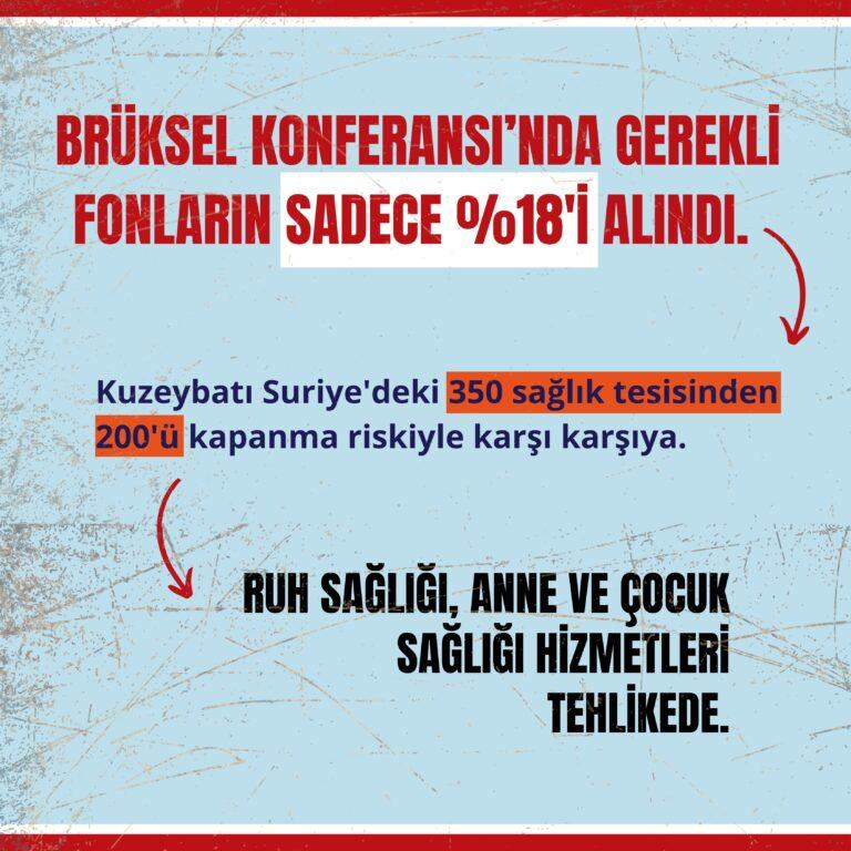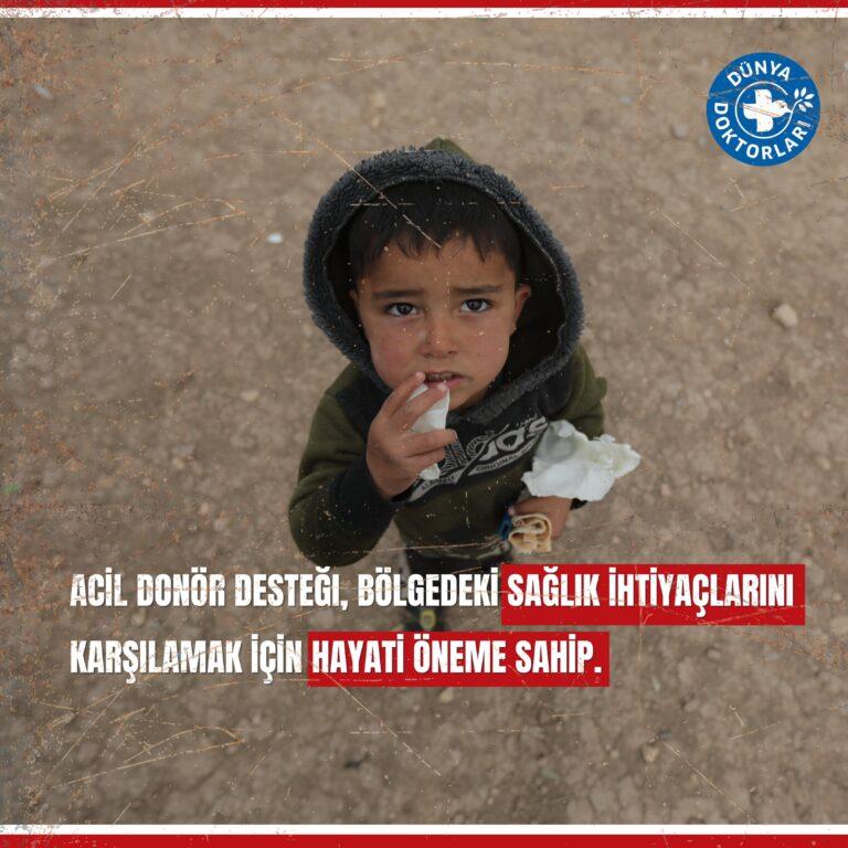 Dünya Doktorları (Médecins du Monde) ve Mehad, sağlık ihtiyaçlarının karşılanması ve herkesin onurlu bir yaşam sürdürebilmesi için bağış ve fon desteğinin acilen artırılması çağrısında bulunuyor. Her insan, kaliteli sağlık hizmetlerine ulaşabilme, en yüksek fiziksel ve ruhsal sağlık standardına sahip olma hakkına sahiptir. Uluslararası toplum, daha fazla sağlık tesisinin kapanmasını önlemek ve Suriye halkının temel sağlık hizmetlerine erişiminin devamlılığını sağlamak için derhal harekete geçmelidir.