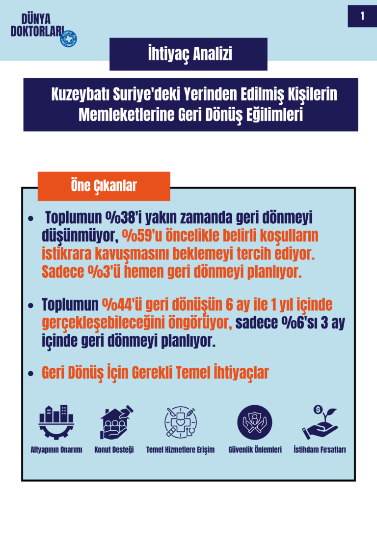 Suriye’deki son dönemde gerçekleşen önemli gelişmeler ışığında, Dünya Doktorları tarafından hazırlanan bu ihtiyaç analizi, Kuzeybatı Suriye’deki yerinden edilmiş kişilerin memleketlerine dönüşle ilgili düşüncelerini anlamayı amaçlamaktadır.