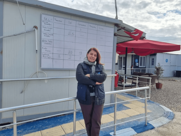 Dünya Doktorları Saha Koordinatörü Aslı Soysal, Antakya’daki kadın ve çocuklara yönelik kabul merkezinde.